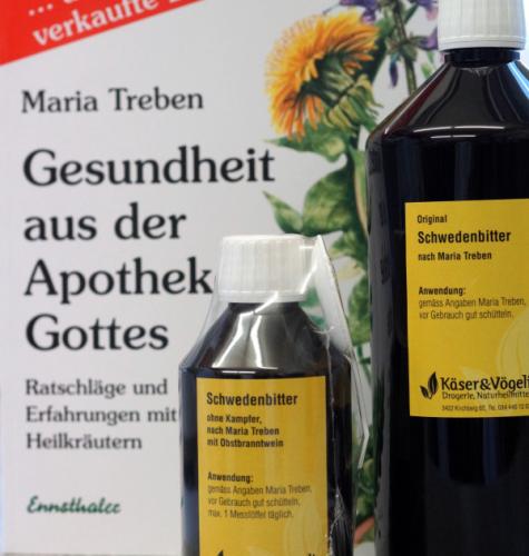 Wir haben verschiedene Bücher von Maria Treben an Lager. Zudem bieten wir Schwedenbitter mit und ohne Kampfer an.